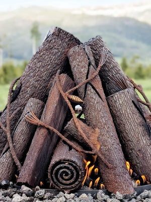 Each burner is custom-tuned to the sculpture, with flame ports that are hand-placed to align with the log design so fire flows naturally through the art.
